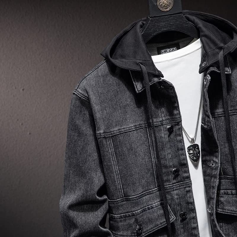 AEBDF Spring Autumn Men Hooded Denim Jacket Dark Grey Slim Casual Youth Coat Male Cowboy Jacket (Color : A, Size : XXXXL Code)