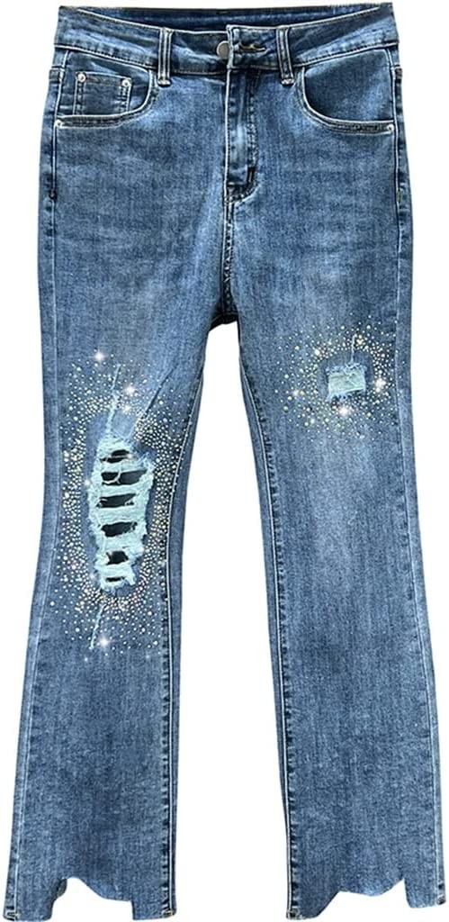 jeans Spring Denim Trousers Pearl Beaded Stretch Slim Jeans for Women Ladies Blue Skinny Flared Jean Feminino (Color : Picture color, Size : L code)