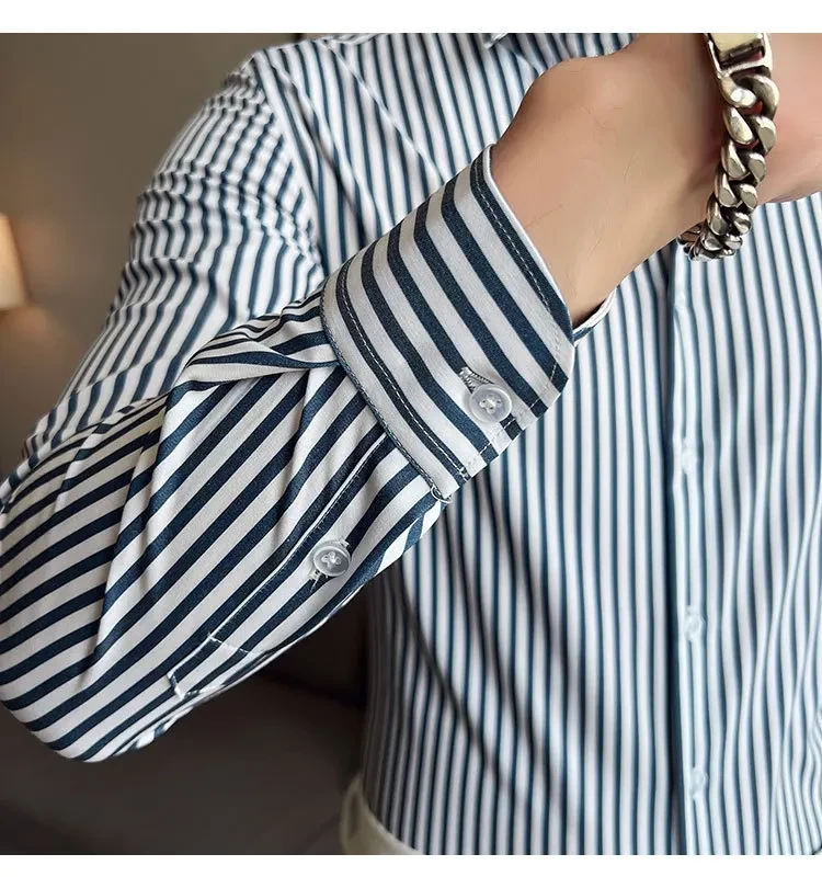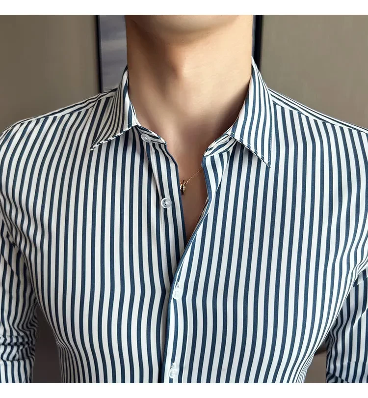 Sophisticated Wrinkle-free Stripe Long Sleeve Shirt Men's Slim Fit Business Classic Blue Casual Stylish